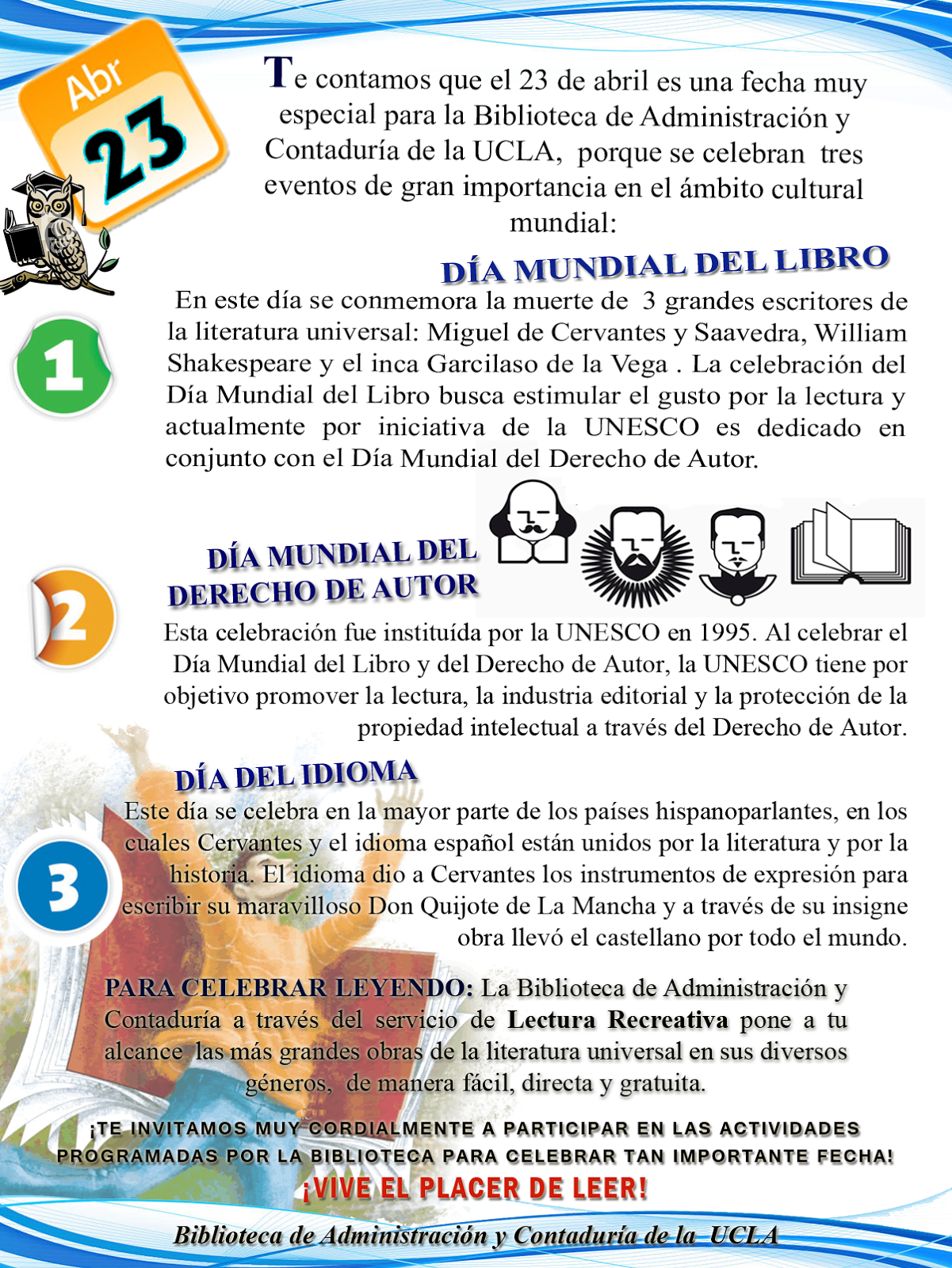 La Biblioteca de Administración y Contaduría Prof. "José Miguel Girón" de la UCLA, invita a toda la Comunidad Universitarias y a los usuarios en general, a las actividades de la Celebración del Día Internacional del Libro, El Idioma y El Drerecho de Autor, a realizarse los días 22, 23 y 24 de Abril de 2013. Habra Exhibición de nuestra Colección de nuestros diferentes servicios, Exposicón de Proveedores, Charlas y Cuenta Cuentos. Todos invitados y a disfrutar de estos días.